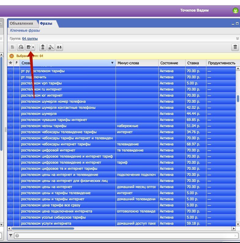 Для проведения оптимизации понадобится функционал программы Yandex Direct Commander. Зайдите в нее и выберите кампании или отдельные группы объявлений, среди которых нужно провести кросс-минусацию. Нажмите кнопку «Мультиредактирование», предварительно удалив дубли.
