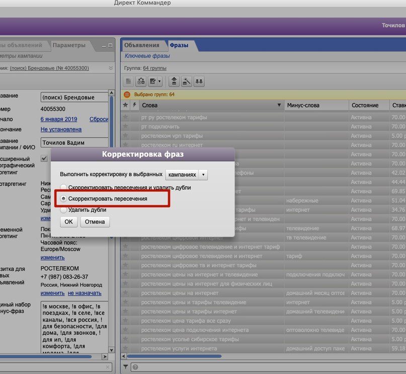 Yandex Direct Commander автоматически проведет кросс-минусацию, но нужно иметь ввиду, что пересечения можно устранить только в тех группах объявлений, которые рекламируют один сайт и рассчитаны на один регион.