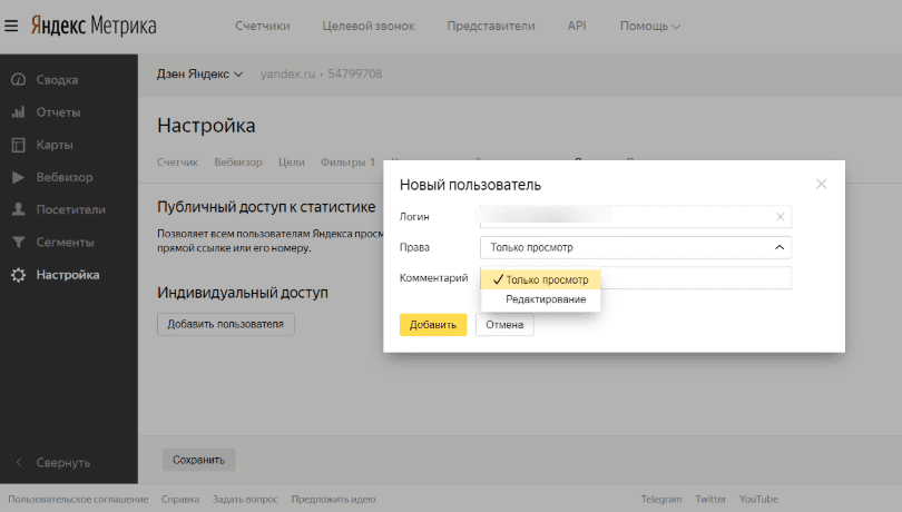 Перейдите к счетчику Яндекс.Метрики и откройте раздел настроек. Найдите вкладку «Доступ». Здесь есть пункт «Индивидуальный доступ», в котором предусмотрена опция «Добавить пользователя». Укажите email и выберите категорию прав (просмотр или редактирование).
