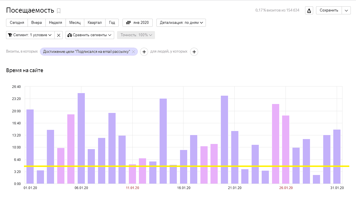 Откройте Яндекс.Метрику и перейдите в отчет о посещаемости сайта. Здесь создайте сегмент, в который будут входить пользователи, совершившие целевое действие. В полученных графиках вы сможете увидеть время, проведенное на сайте этими посетителями, и высчитать среднее значение до конверсии.