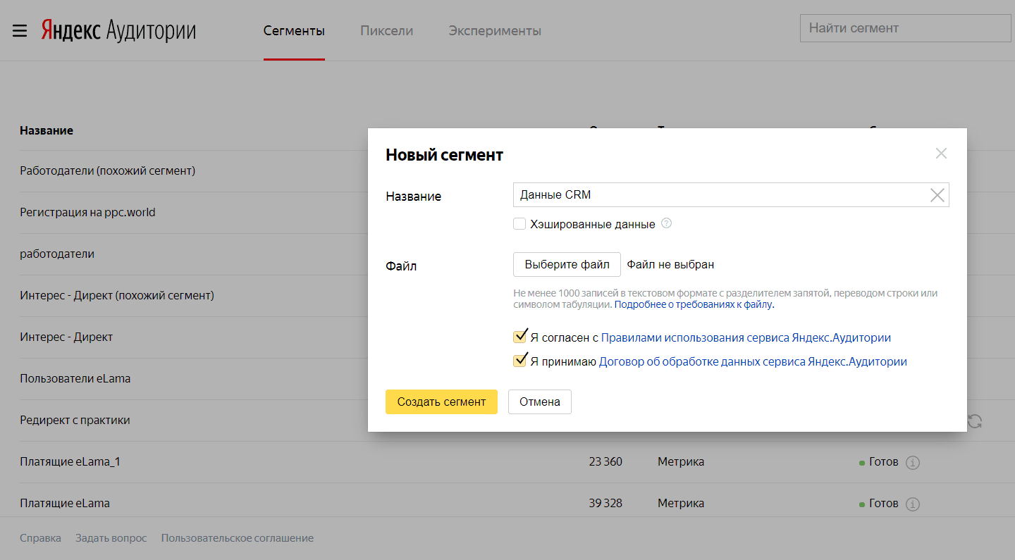 Откройте сервис Яндекс.Аудитории и перейдите к разделу «Сегменты». Нажмите кнопку «Создать» и загрузите нужную базу в виде файла объемом до 1 Гб в формате .txt, .csv.