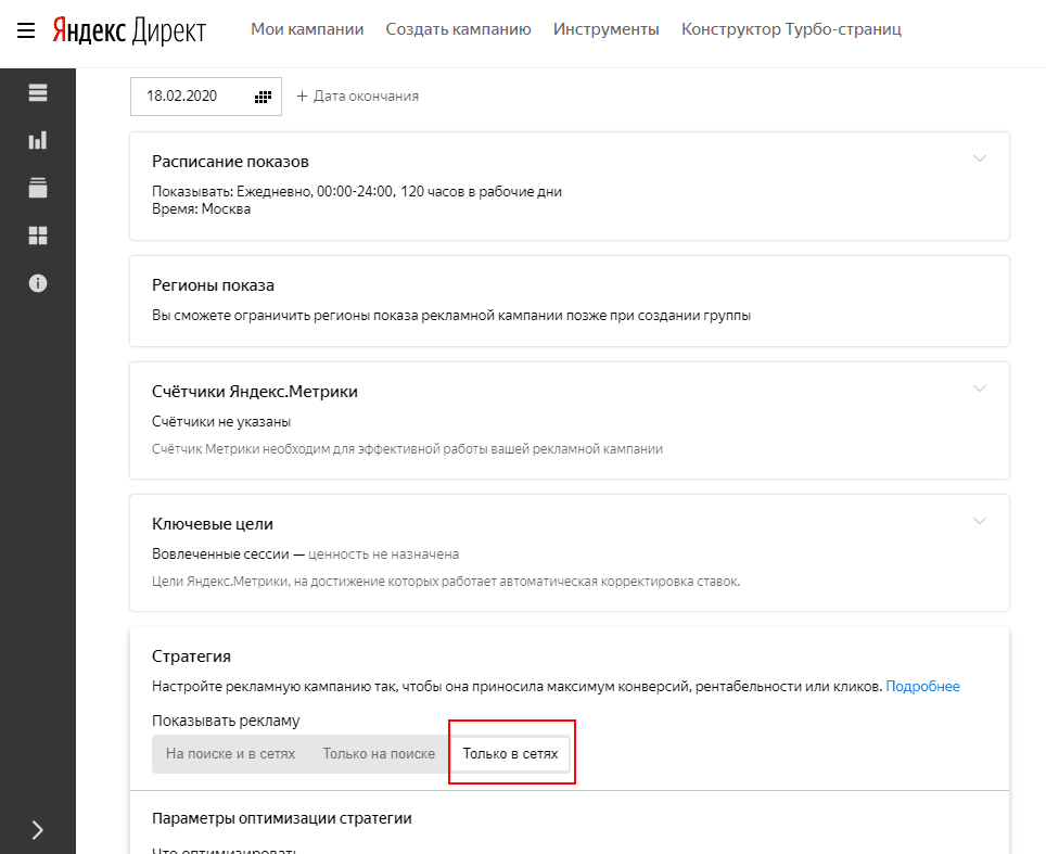 Для новой кампании выберите текстово-графический формат. В качестве стратегии укажите вариант «Только в сетях», так как на поиске догоняющая реклама не работает.