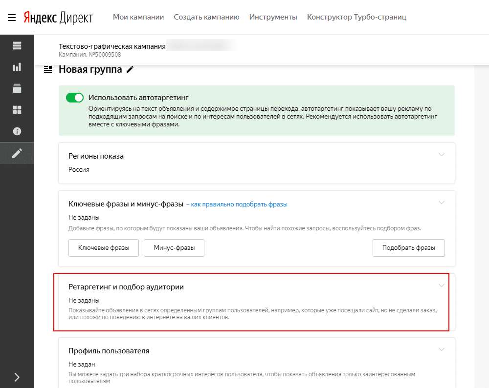 В блоке параметров создаваемой рекламной кампании выберите раздел «Ретаргетинг и подбор аудитории».