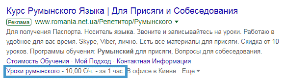 Расширение «Цена» демонстрирует в текстовом объявлении конкретный продукт или услугу с ее актуальной стоимостью.