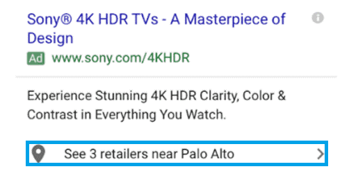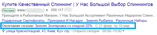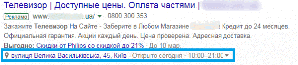 Расширение «Местоположение» показывает адрес и часы работы компании. Оно полезно для тех рекламодателей, которые нацелены на клиентов, находящихся рядом с точкой продаж.