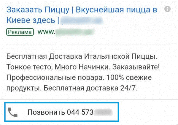 Указывая в расширениях телефон, легко повысить кликабельность при просмотре с мобильных устройств. Пользователь может сразу тапнуть на номер телефона в объявлении, чтобы перейти к окну вызова.