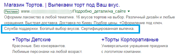 Опция «Уточнения» позволяет добавить текст без возможности клика. Сюда, как правило, вписывается то, что поможет повысить CTR, не смещая фокуса с призыва к действию.