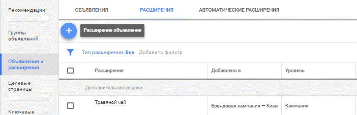 Чтобы добавить расширения, нужно перейти в рекламный кабинет и выбрать интересующую группу объявлений. В меню слева выберите раздел «Объявления и расширения», а затем нажмите на плюс в верхней части страницы.