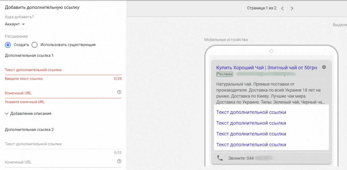 С учетом того, что дополнительная информация показывается не всегда, а выбор типа расширения осуществляется автоматически, Google ADS рекомендует использовать как можно большее число вариантов, подходящих вашему бизнесу.