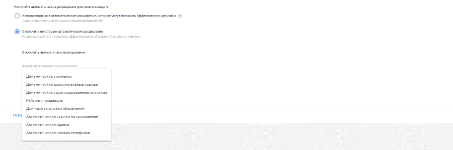 Чтобы отключить дополнительные расширения, содержание которых нельзя контролировать, нужно, оставаясь в разделе «Объявления и расширения», выбрать пункт «Автоматические расширения» (вверху списка). После этого нажмите кнопку «Дополнительно» в правом верхнем углу экрана и выберите раздел «Отключить некоторые автоматические расширения». В появившемся списке выберите те варианты, которые не должны показываться без ручной настройки.