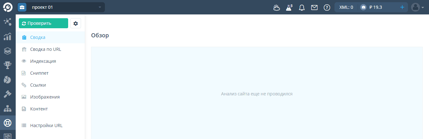 После регистрации нужно добавить свой проект при помощи одноимённой функции в правом углу рабочего окна. Проект – это домен или адрес вашего сайта, который системе нужно анализировать. Здесь вы сможете указать название проекта и настроить дополнительные параметры.