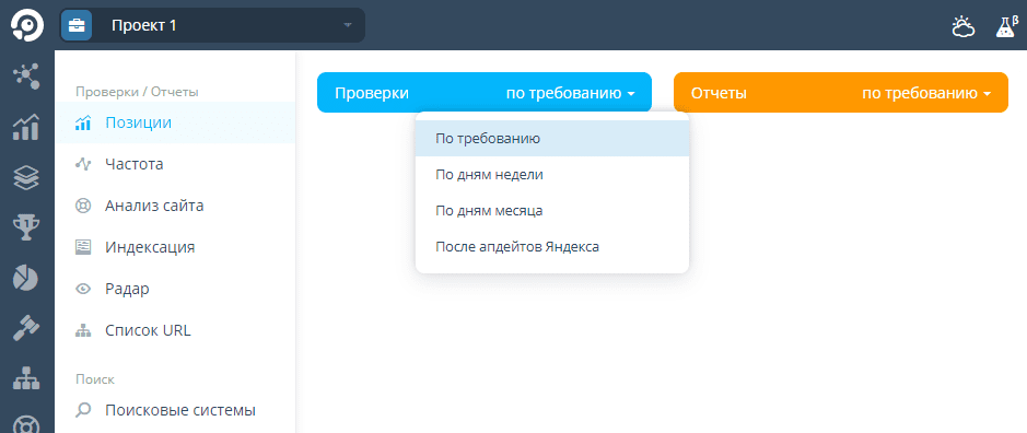 Во вкладке «Проверка» настройте запуск анализа по расписанию, вручную или сразу после обновления системы Яндекс.